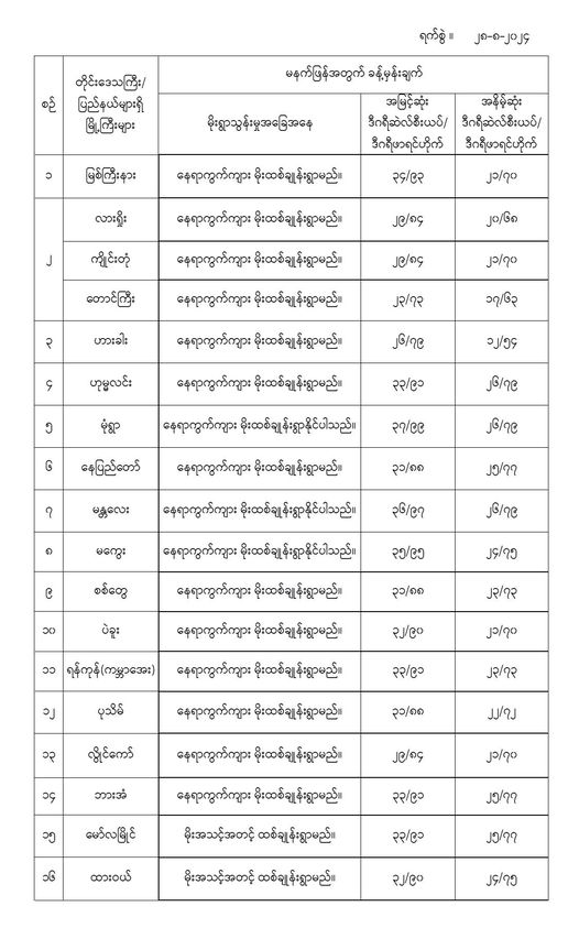 မနက်ဖြန်အတွက် တိုင်းဒေသကြီးနှင့် ပြည်နယ်များရှိ မြို့ကြီးများ၏ အမြင့်ဆုံးအပူချိန်၊ အနိမ့်ဆုံးအပူချိန်နှင့် မိုးလေဝသခန့်မှန်းချက်တို့ပဲဖြစ်ပါတယ်---