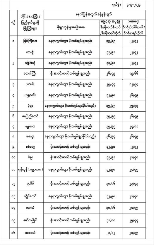 မနက်ဖြန်အတွက် တိုင်းဒေသကြီးနှင့် ပြည်နယ်များရှိ မြို့ကြီးများ၏ အမြင့်ဆုံးအပူချိန်၊ အနိမ့်ဆုံးအပူချိန်နှင့် မိုးလေဝသခန့်မှန်းချက်တို့ပဲဖြစ်ပါတယ်---