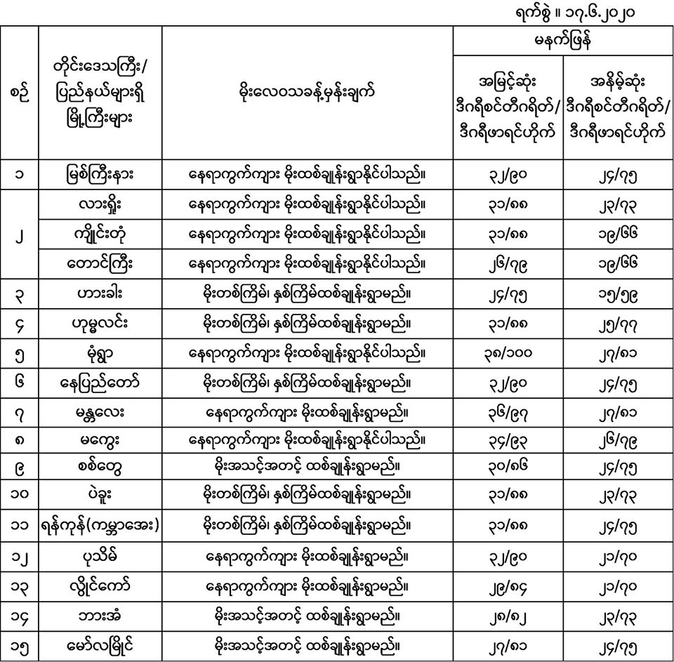 အောက်မှာဖော်ပြထားတာကတော့ မနက်ဖြန်အတွက် တိုင်းဒေသကြီးနှင့် ပြည်နယ်များရှိ မြို့ကြီးများ၏ အမြင့်ဆုံးအပူချိန်၊ အနိမ့်ဆုံးအပူချိန်နှင့် မိုးလေဝသခန့်မှန်းချက်တို့ပဲ ဖြစ်ပါတယ်။