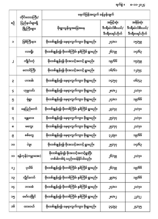 မနက်ဖြန်အတွက် တိုင်းဒေသကြီးနှင့် ပြည်နယ်များရှိ မြို့ကြီးများ၏ အမြင့်ဆုံးအပူချိန်၊ အနိမ့်ဆုံးအပူချိန်နှင့် မိုးလေဝသခန့်မှန်းချက်တို့ပဲဖြစ်ပါတယ်-------