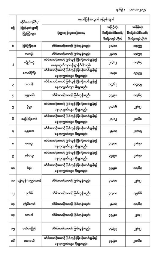 မနက်ဖြန်အတွက် တိုင်းဒေသကြီးနှင့် ပြည်နယ်များရှိ မြို့ကြီးများ၏ အမြင့်ဆုံးအပူချိန်၊ အနိမ့်ဆုံးအပူချိန်နှင့် မိုးလေဝသခန့်မှန်းချက်တို့ပဲဖြစ်ပါတယ်---