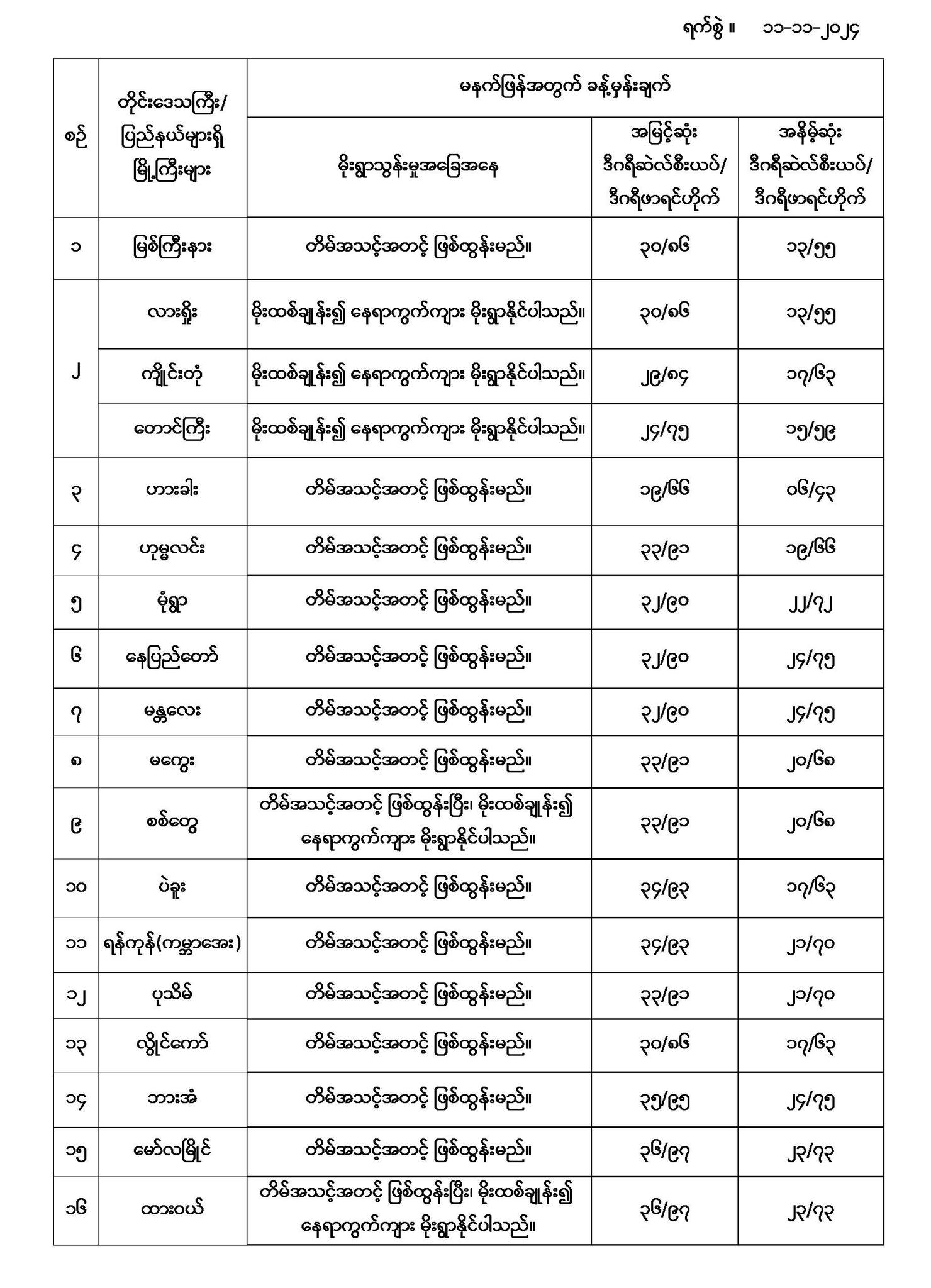 မနက်ဖြန်အတွက် တိုင်းဒေသကြီးနှင့် ပြည်နယ်များရှိ မြို့ကြီးများ၏ အမြင့်ဆုံးအပူချိန်၊ အနိမ့်ဆုံးအပူချိန်နှင့် မိုးလေဝသခန့်မှန်းချက်တို့ပဲဖြစ်ပါတယ်---