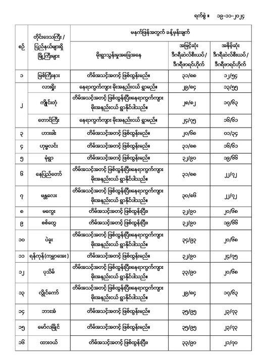 မနက်ဖြန်အတွက် တိုင်းဒေသကြီးနှင့် ပြည်နယ်များရှိ မြို့ကြီးများ၏ အမြင့်ဆုံးအပူချိန်၊ အနိမ့်ဆုံးအပူချိန်နှင့် မိုးလေဝသခန့်မှန်းချက်တို့ပဲဖြစ်ပါတယ်---