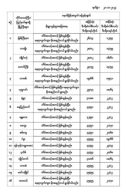 မနက်ဖြန်အတွက် တိုင်းဒေသကြီးနှင့် ပြည်နယ်များရှိ မြို့ကြီးများ၏ အမြင့်ဆုံးအပူချိန်၊ အနိမ့်ဆုံးအပူချိန်နှင့် မိုးလေဝသခန့်မှန်းချက်တို့ပဲဖြစ်ပါတယ်---