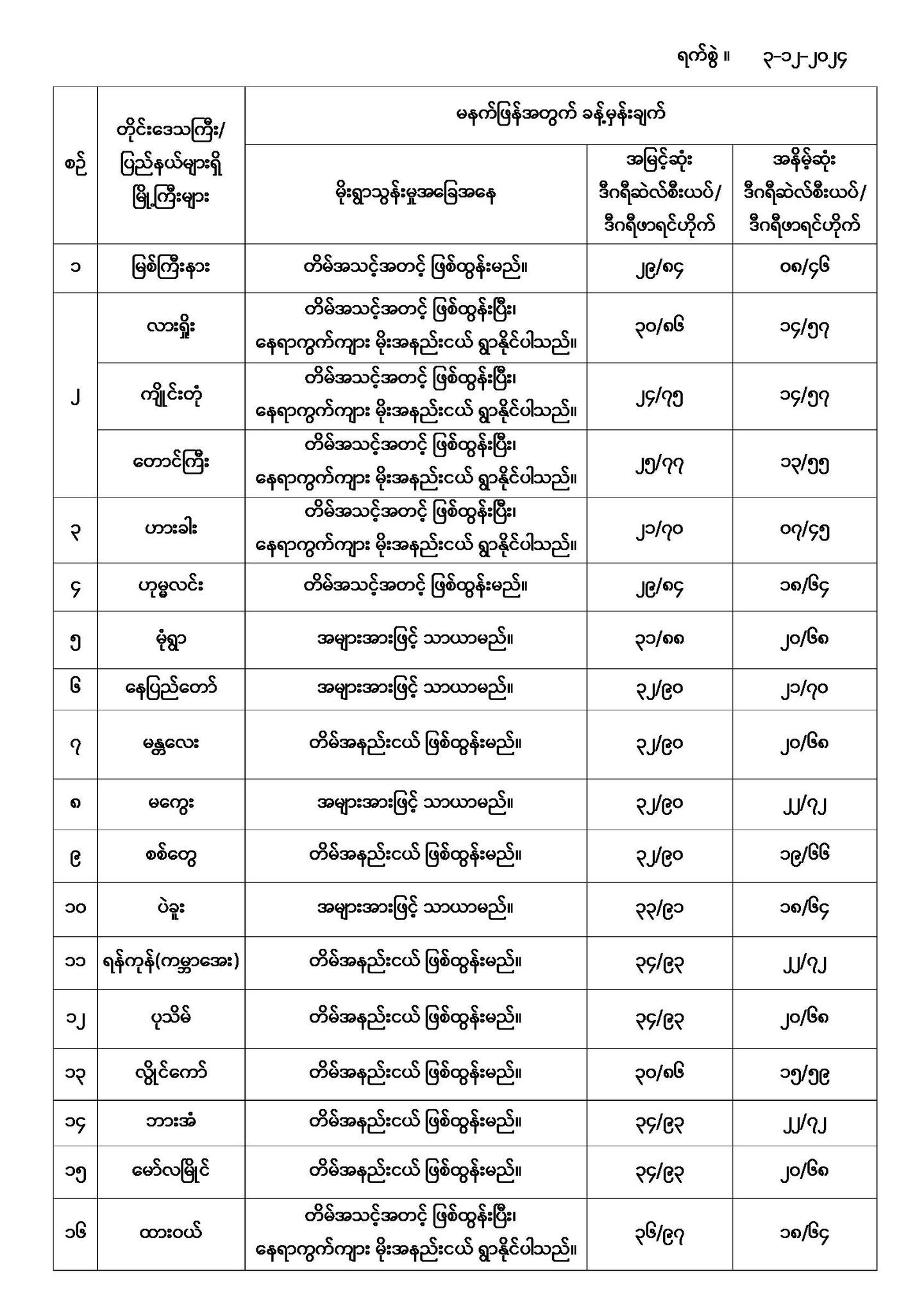 မနက်ဖြန်အတွက် တိုင်းဒေသကြီးနှင့် ပြည်နယ်များရှိ မြို့ကြီးများ၏ အမြင့်ဆုံးအပူချိန်၊ အနိမ့်ဆုံးအပူချိန်နှင့် မိုးလေဝသခန့်မှန်းချက်တို့ပဲဖြစ်ပါတယ်---