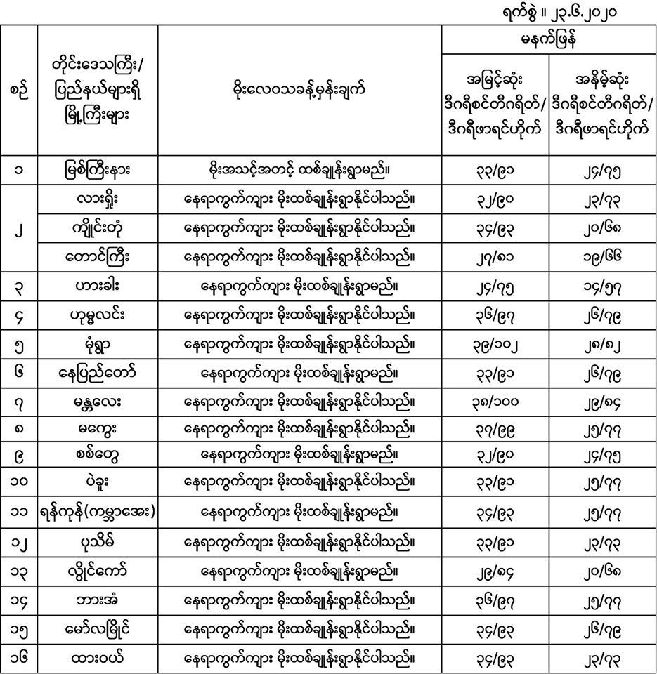 အောက်မှာဖော်ပြထားတာကတော့ မနက်ဖြန်အတွက် တိုင်းဒေသကြီးနှင့် ပြည်နယ်များရှိ မြို့ကြီးများ၏ အမြင့်ဆုံးအပူချိန်၊ အနိမ့်ဆုံးအပူချိန်နှင့် မိုးလေဝသခန့်မှန်းချက်တို့ပဲဖြစ်ပါတယ်။