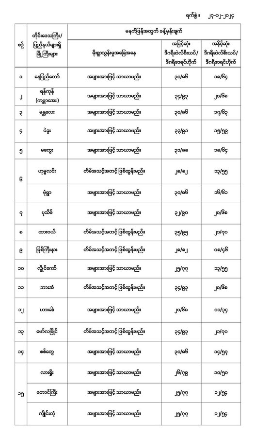 မနက်ဖြန်အတွက် တိုင်းဒေသကြီးနှင့် ပြည်နယ်များရှိ မြို့ကြီးများ၏ အမြင့်ဆုံးအပူချိန်၊ အနိမ့်ဆုံးအပူချိန်နှင့် မိုးလေဝသခန့်မှန်းချက်တို့ပဲဖြစ်ပါတယ်---