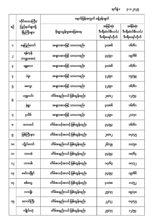 မနက်ဖြန်အတွက် တိုင်းဒေသကြီးနှင့် ပြည်နယ်များရှိ မြို့ကြီးများ၏ အမြင့်ဆုံးအပူချိန်၊ အနိမ့်ဆုံးအပူချိန်နှင့် မိုးလေဝသခန့်မှန်းချက်တို့ပဲဖြစ်ပါတယ်---