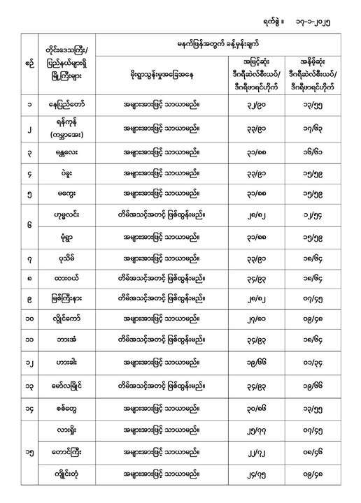 မနက်ဖြန်အတွက် တိုင်းဒေသကြီးနှင့် ပြည်နယ်များရှိ မြို့ကြီးများ၏ အမြင့်ဆုံးအပူချိန်၊ အနိမ့်ဆုံးအပူချိန်နှင့် မိုးလေဝသခန့်မှန်းချက်တို့ပဲဖြစ်ပါတယ်---