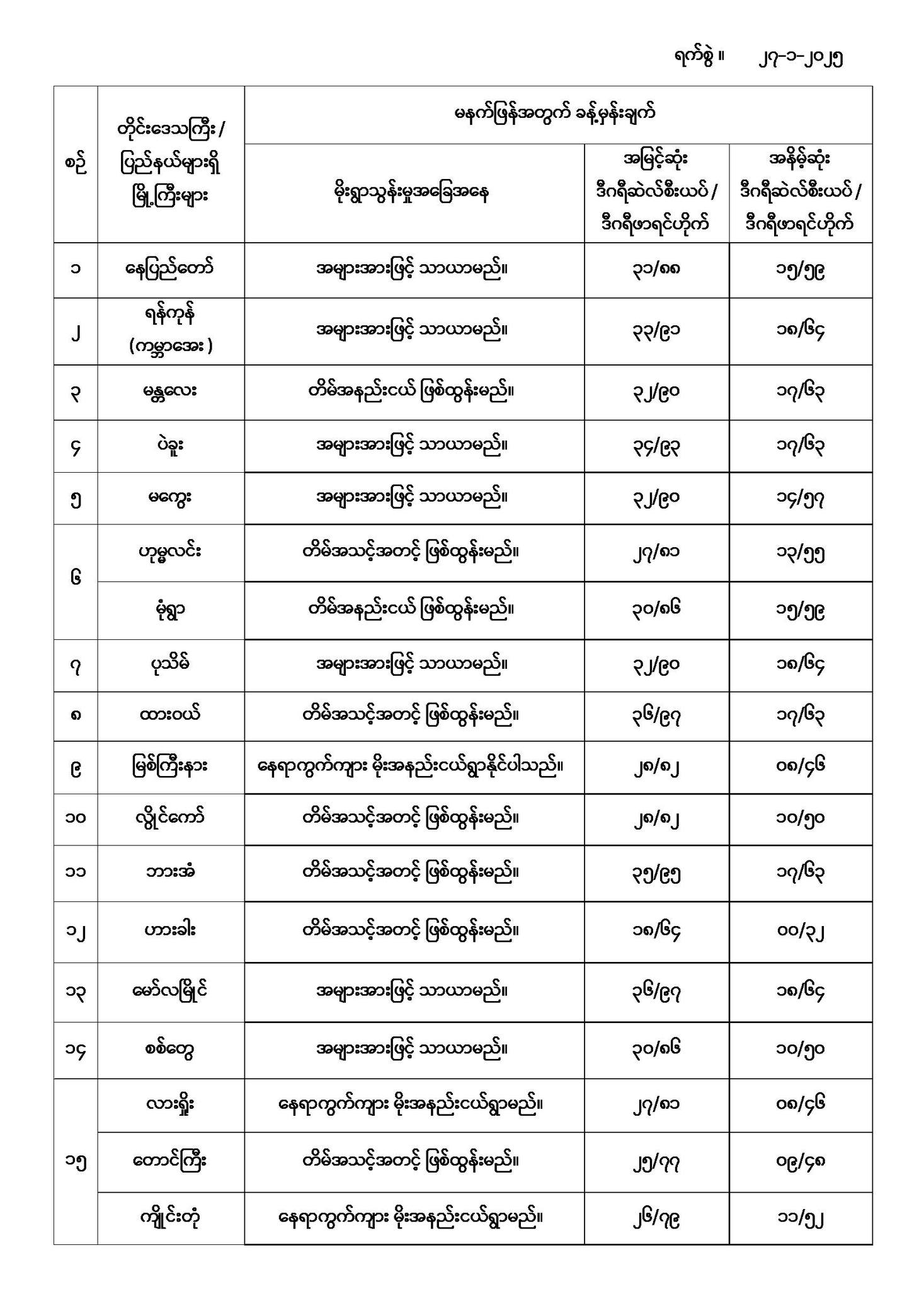 မနက်ဖြန်အတွက် တိုင်းဒေသကြီးနှင့် ပြည်နယ်များရှိ မြို့ကြီးများ၏ အမြင့်ဆုံးအပူချိန်၊ အနိမ့်ဆုံးအပူချိန်နှင့် မိုးလေဝသခန့်မှန်းချက်တို့ပဲဖြစ်ပါတယ်---