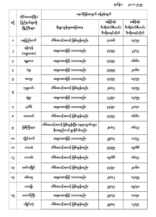 မနက်ဖြန်အတွက် တိုင်းဒေသကြီးနှင့် ပြည်နယ်များရှိ မြို့ကြီးများ၏ အမြင့်ဆုံးအပူချိန်၊ အနိမ့်ဆုံးအပူချိန်နှင့် မိုးလေဝသခန့်မှန်းချက်တို့ပဲဖြစ်ပါတယ်---