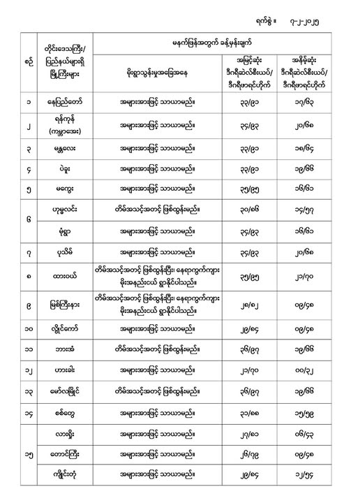 မနက်ဖြန်အတွက် တိုင်းဒေသကြီးနှင့် ပြည်နယ်များရှိ မြို့ကြီးများ၏ အမြင့်ဆုံးအပူချိန်၊ အနိမ့်ဆုံးအပူချိန်နှင့် မိုးလေဝသခန့်မှန်းချက်တို့ပဲဖြစ်ပါတယ်---