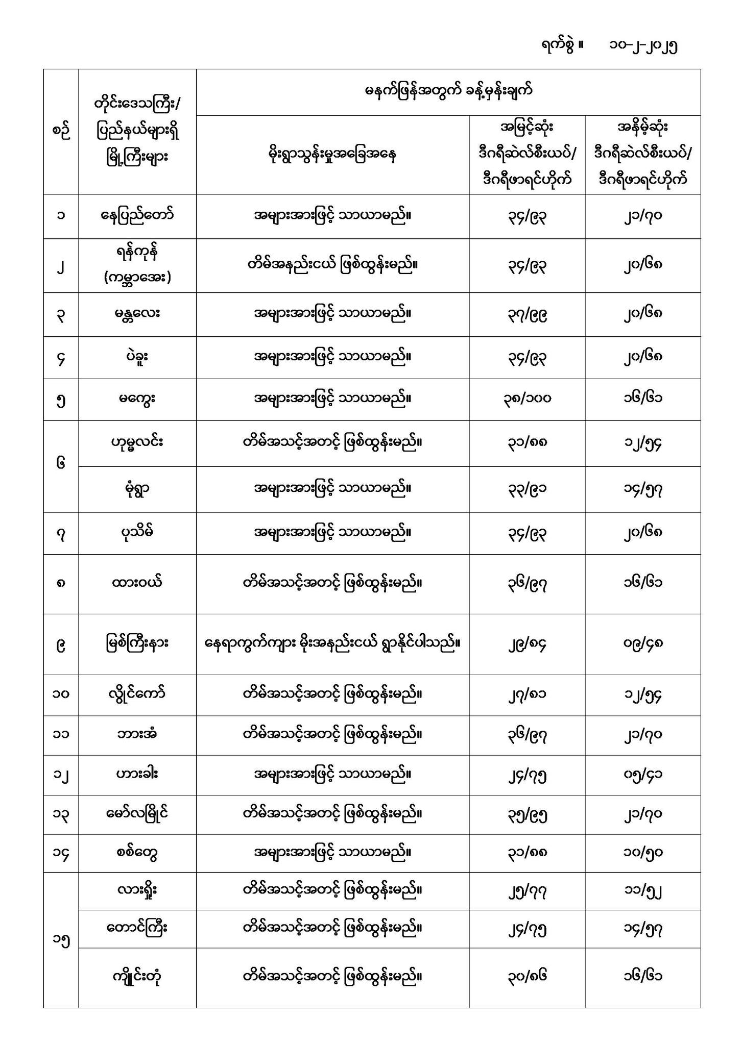 မနက်ဖြန်အတွက် တိုင်းဒေသကြီးနှင့် ပြည်နယ်များရှိ မြို့ကြီးများ၏ အမြင့်ဆုံးအပူချိန်၊ အနိမ့်ဆုံးအပူချိန်နှင့် မိုးလေဝသခန့်မှန်းချက်တို့ပဲဖြစ်ပါတယ်---