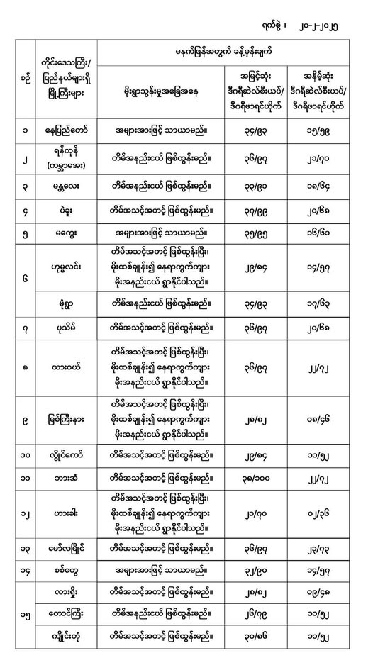 မနက်ဖြန်အတွက် တိုင်းဒေသကြီးနှင့် ပြည်နယ်များရှိ မြို့ကြီးများ၏ အမြင့်ဆုံးအပူချိန်၊ အနိမ့်ဆုံးအပူချိန်နှင့် မိုးလေဝသခန့်မှန်းချက်တို့ပဲဖြစ်ပါတယ်---