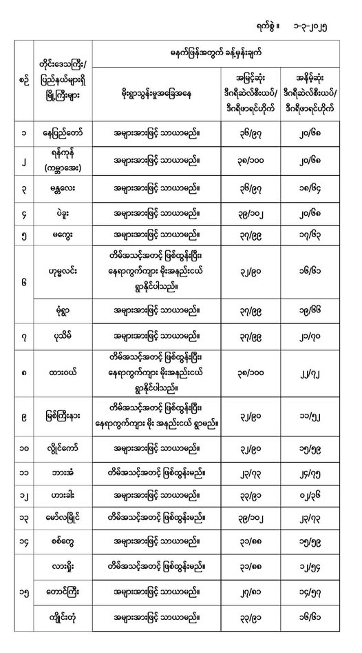 မနက်ဖြန်အတွက် တိုင်းဒေသကြီးနှင့် ပြည်နယ်များရှိ မြို့ကြီးများ၏ အမြင့်ဆုံးအပူချိန်၊ အနိမ့်ဆုံးအပူချိန်နှင့် မိုးလေဝသခန့်မှန်းချက်တို့ပဲဖြစ်ပါတယ်---