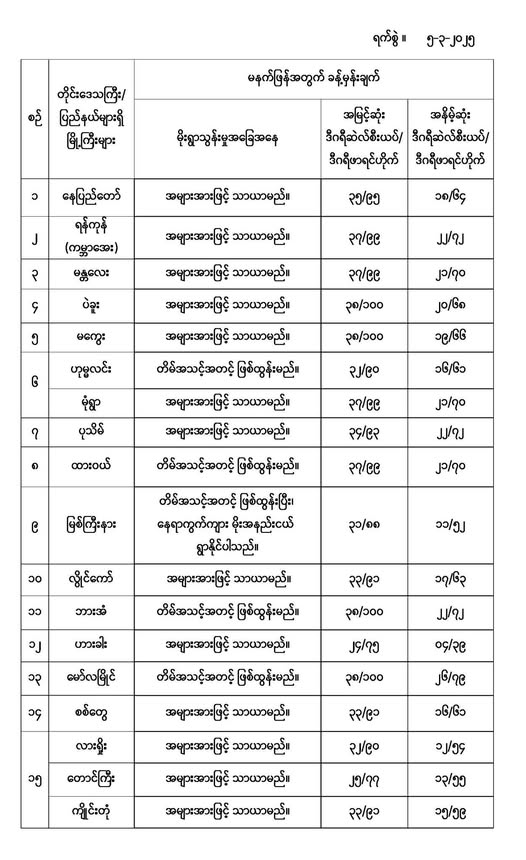 မနက်ဖြန်အတွက် တိုင်းဒေသကြီးနှင့် ပြည်နယ်များရှိ မြို့ကြီးများ၏ အမြင့်ဆုံးအပူချိန်၊ အနိမ့်ဆုံးအပူချိန်နှင့် မိုးလေဝသခန့်မှန်းချက်တို့ပဲဖြစ်ပါတယ်---