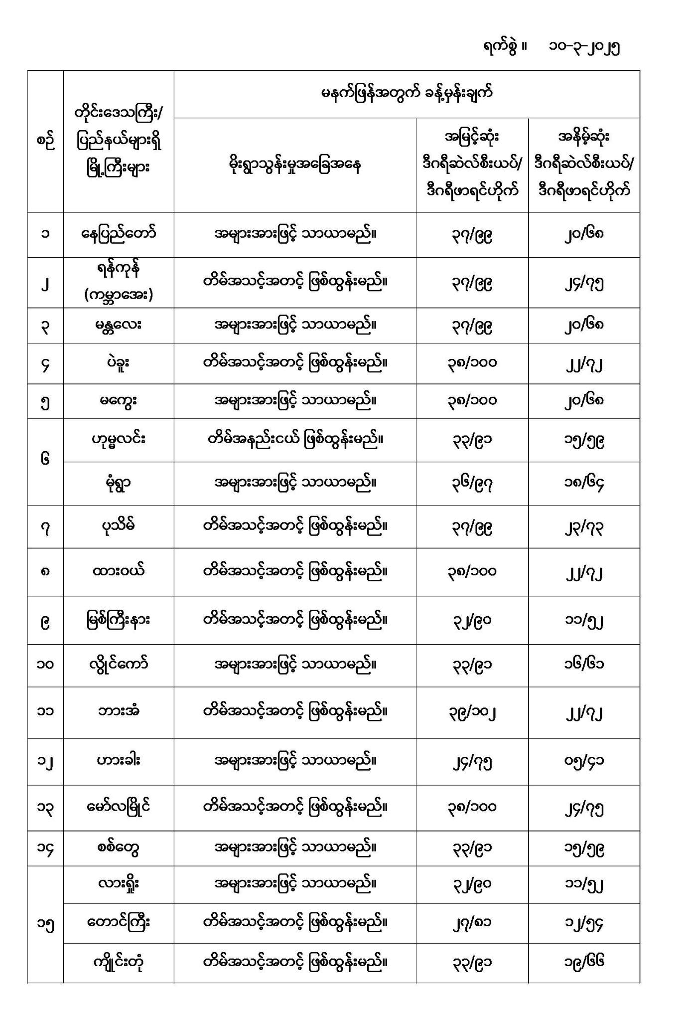 မနက်ဖြန်အတွက် တိုင်းဒေသကြီးနှင့် ပြည်နယ်များရှိ မြို့ကြီးများ၏ အမြင့်ဆုံးအပူချိန်၊ အနိမ့်ဆုံးအပူချိန်နှင့် မိုးလေဝသခန့်မှန်းချက်တို့ပဲဖြစ်ပါတယ်---