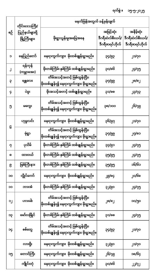 မနက်ဖြန်အတွက် တိုင်းဒေသကြီးနှင့် ပြည်နယ်များရှိ မြို့ကြီးများ၏ အမြင့်ဆုံးအပူချိန်၊ အနိမ့်ဆုံးအပူချိန်နှင့် မိုးလေဝသခန့်မှန်းချက်တို့ပဲဖြစ်ပါတယ်---