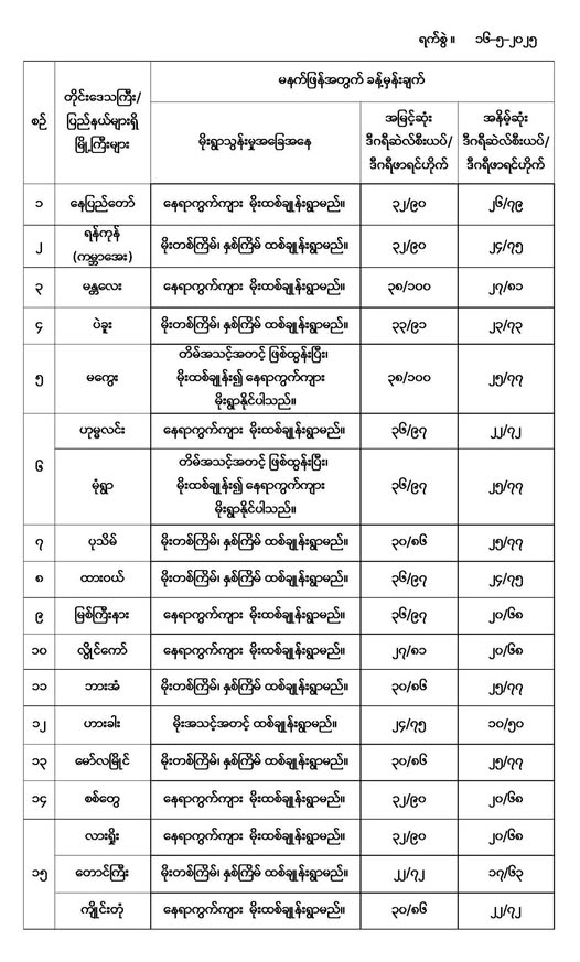 မနက်ဖြန်အတွက် တိုင်းဒေသကြီးနှင့် ပြည်နယ်များရှိ မြို့ကြီးများ၏ အမြင့်ဆုံးအပူချိန်၊ အနိမ့်ဆုံးအပူချိန်နှင့် မိုးလေဝသခန့်မှန်းချက်တို့ပဲဖြစ်ပါတယ်---