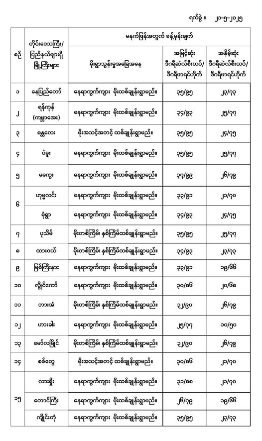 မနက်ဖြန်အတွက် တိုင်းဒေသကြီးနှင့် ပြည်နယ်များရှိ မြို့ကြီးများ၏ အမြင့်ဆုံးအပူချိန်၊ အနိမ့်ဆုံးအပူချိန်နှင့် မိုးလေဝသခန့်မှန်းချက်တို့ပဲဖြစ်ပါတယ်---
