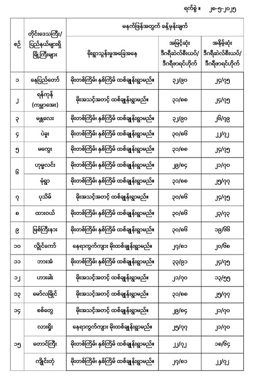 မနက်ဖြန်အတွက် တိုင်းဒေသကြီးနှင့် ပြည်နယ်များရှိ မြို့ကြီးများ၏ အမြင့်ဆုံးအပူချိန်၊ အနိမ့်ဆုံးအပူချိန်နှင့် မိုးလေဝသခန့်မှန်းချက်တို့ပဲဖြစ်ပါတယ်---