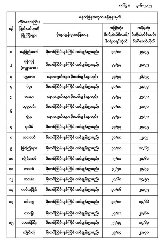 မနက်ဖြန်အတွက် တိုင်းဒေသကြီးနှင့် ပြည်နယ်များရှိ မြို့ကြီးများ၏ အမြင့်ဆုံးအပူချိန်၊ အနိမ့်ဆုံးအပူချိန်နှင့် မိုးလေဝသခန့်မှန်းချက်တို့ပဲဖြစ်ပါတယ်---