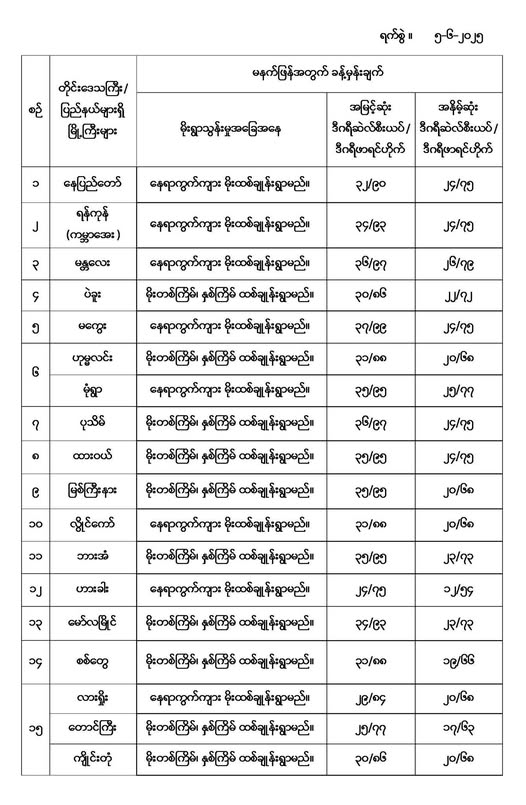 မနက်ဖြန်အတွက် တိုင်းဒေသကြီးနှင့် ပြည်နယ်များရှိ မြို့ကြီးများ၏ အမြင့်ဆုံးအပူချိန်၊ အနိမ့်ဆုံးအပူချိန်နှင့် မိုးလေဝသခန့်မှန်းချက်တို့ပဲဖြစ်ပါတယ်---