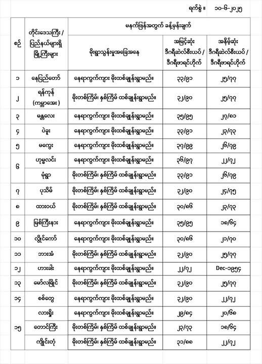 မနက်ဖြန်အတွက် တိုင်းဒေသကြီးနှင့် ပြည်နယ်များရှိ မြို့ကြီးများ၏ အမြင့်ဆုံးအပူချိန်၊ အနိမ့်ဆုံးအပူချိန်နှင့် မိုးလေဝသခန့်မှန်းချက်တို့ပဲဖြစ်ပါတယ်---