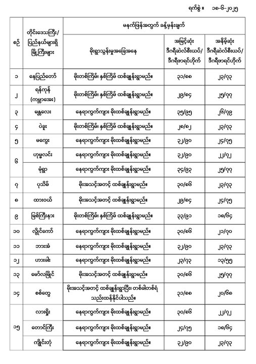 မနက်ဖြန်အတွက် တိုင်းဒေသကြီးနှင့် ပြည်နယ်များရှိ မြို့ကြီးများ၏ အမြင့်ဆုံးအပူချိန်၊ အနိမ့်ဆုံးအပူချိန်နှင့် မိုးလေဝသခန့်မှန်းချက်တို့ပဲဖြစ်ပါတယ်---