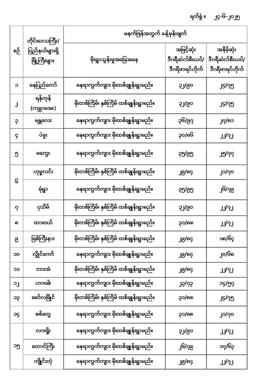 မနက်ဖြန်အတွက် တိုင်းဒေသကြီးနှင့် ပြည်နယ်များရှိ မြို့ကြီးများ၏ အမြင့်ဆုံးအပူချိန်၊ အနိမ့်ဆုံးအပူချိန်နှင့် မိုးလေဝသခန့်မှန်းချက်တို့ပဲဖြစ်ပါတယ်---