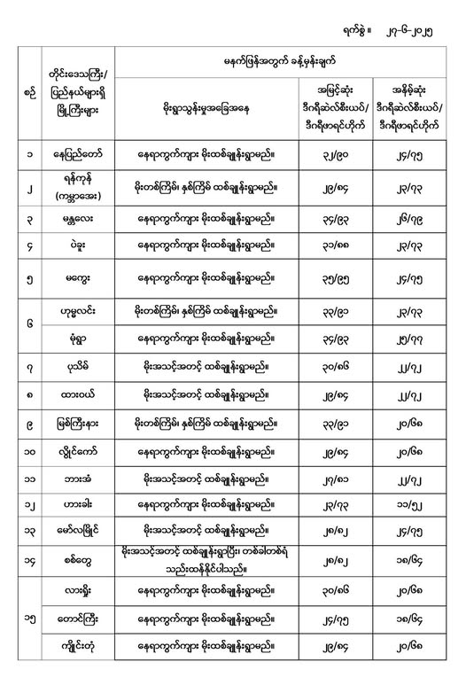 မနက်ဖြန်အတွက် တိုင်းဒေသကြီးနှင့် ပြည်နယ်များရှိ မြို့ကြီးများ၏ အမြင့်ဆုံးအပူချိန်၊ အနိမ့်ဆုံးအပူချိန်နှင့် မိုးလေဝသခန့်မှန်းချက်တို့ပဲဖြစ်ပါတယ်---