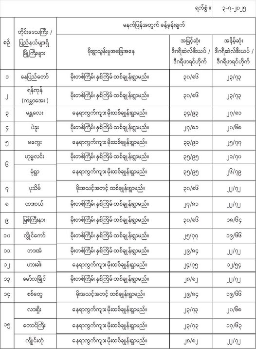 မနက်ဖြန်အတွက် တိုင်းဒေသကြီးနှင့် ပြည်နယ်များရှိ မြို့ကြီးများ၏ အမြင့်ဆုံးအပူချိန်၊ အနိမ့်ဆုံးအပူချိန်နှင့် မိုးလေဝသခန့်မှန်းချက်တို့ပဲဖြစ်ပါတယ်---