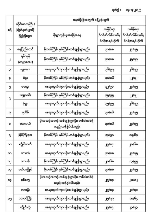 မနက်ဖြန်အတွက် တိုင်းဒေသကြီးနှင့် ပြည်နယ်များရှိ မြို့ကြီးများ၏ အမြင့်ဆုံးအပူချိန်၊ အနိမ့်ဆုံးအပူချိန်နှင့် မိုးလေဝသခန့်မှန်းချက်တို့ပဲဖြစ်ပါတယ်---