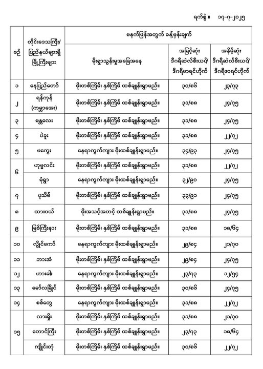 မနက်ဖြန်အတွက် တိုင်းဒေသကြီးနှင့် ပြည်နယ်များရှိ မြို့ကြီးများ၏ အမြင့်ဆုံးအပူချိန်၊ အနိမ့်ဆုံးအပူချိန်နှင့် မိုးလေဝသခန့်မှန်းချက်တို့ပဲဖြစ်ပါတယ်---
