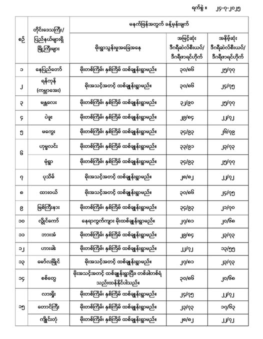 မနက်ဖြန်အတွက် တိုင်းဒေသကြီးနှင့် ပြည်နယ်များရှိ မြို့ကြီးများ၏ အမြင့်ဆုံးအပူချိန်၊ အနိမ့်ဆုံးအပူချိန်နှင့် မိုးလေဝသခန့်မှန်းချက်တို့ပဲဖြစ်ပါတယ်---