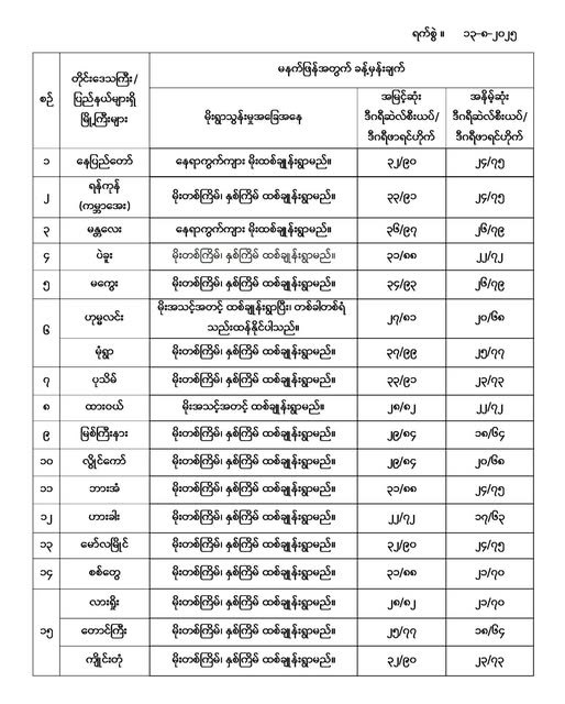 မနက်ဖြန်အတွက် တိုင်းဒေသကြီးနှင့် ပြည်နယ်များရှိ မြို့ကြီးများ၏ အမြင့်ဆုံးအပူချိန်၊ အနိမ့်ဆုံးအပူချိန်နှင့် မိုးလေဝသခန့်မှန်းချက်တို့ပဲဖြစ်ပါတယ်---