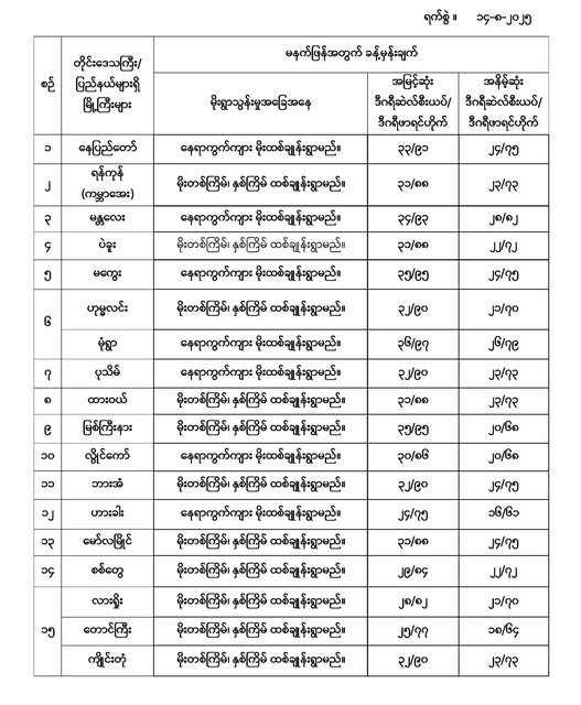 မနက်ဖြန်အတွက် တိုင်းဒေသကြီးနှင့် ပြည်နယ်များရှိ မြို့ကြီးများ၏ အမြင့်ဆုံးအပူချိန်၊ အနိမ့်ဆုံးအပူချိန်နှင့် မိုးလေဝသခန့်မှန်းချက်တို့ပဲဖြစ်ပါတယ်---