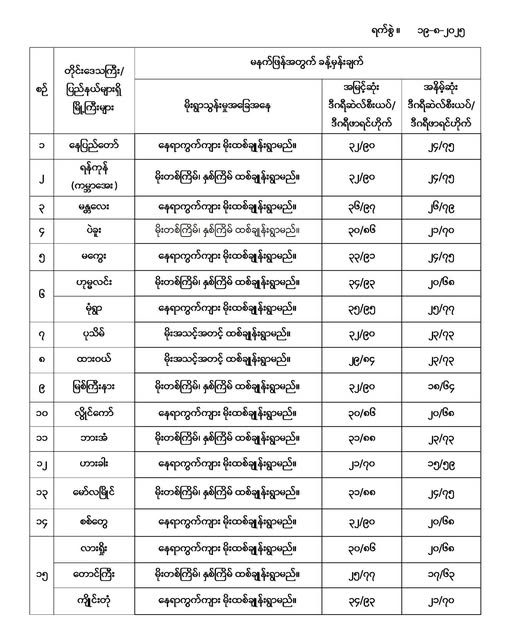 မနက်ဖြန်အတွက် တိုင်းဒေသကြီးနှင့် ပြည်နယ်များရှိ မြို့ကြီးများ၏ အမြင့်ဆုံးအပူချိန်၊ အနိမ့်ဆုံးအပူချိန်နှင့် မိုးလေဝသခန့်မှန်းချက်တို့ပဲဖြစ်ပါတယ်---