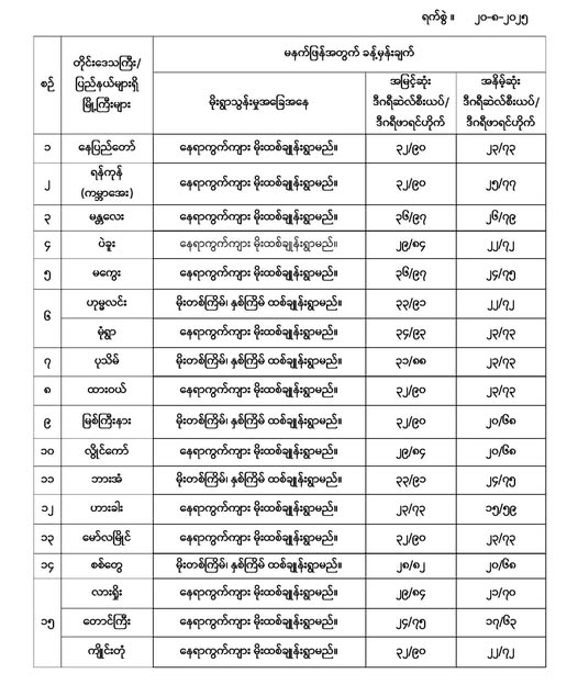 မနက်ဖြန်အတွက် တိုင်းဒေသကြီးနှင့် ပြည်နယ်များရှိ မြို့ကြီးများ၏ အမြင့်ဆုံးအပူချိန်၊ အနိမ့်ဆုံးအပူချိန်နှင့် မိုးလေဝသခန့်မှန်းချက်တို့ပဲဖြစ်ပါတယ်---