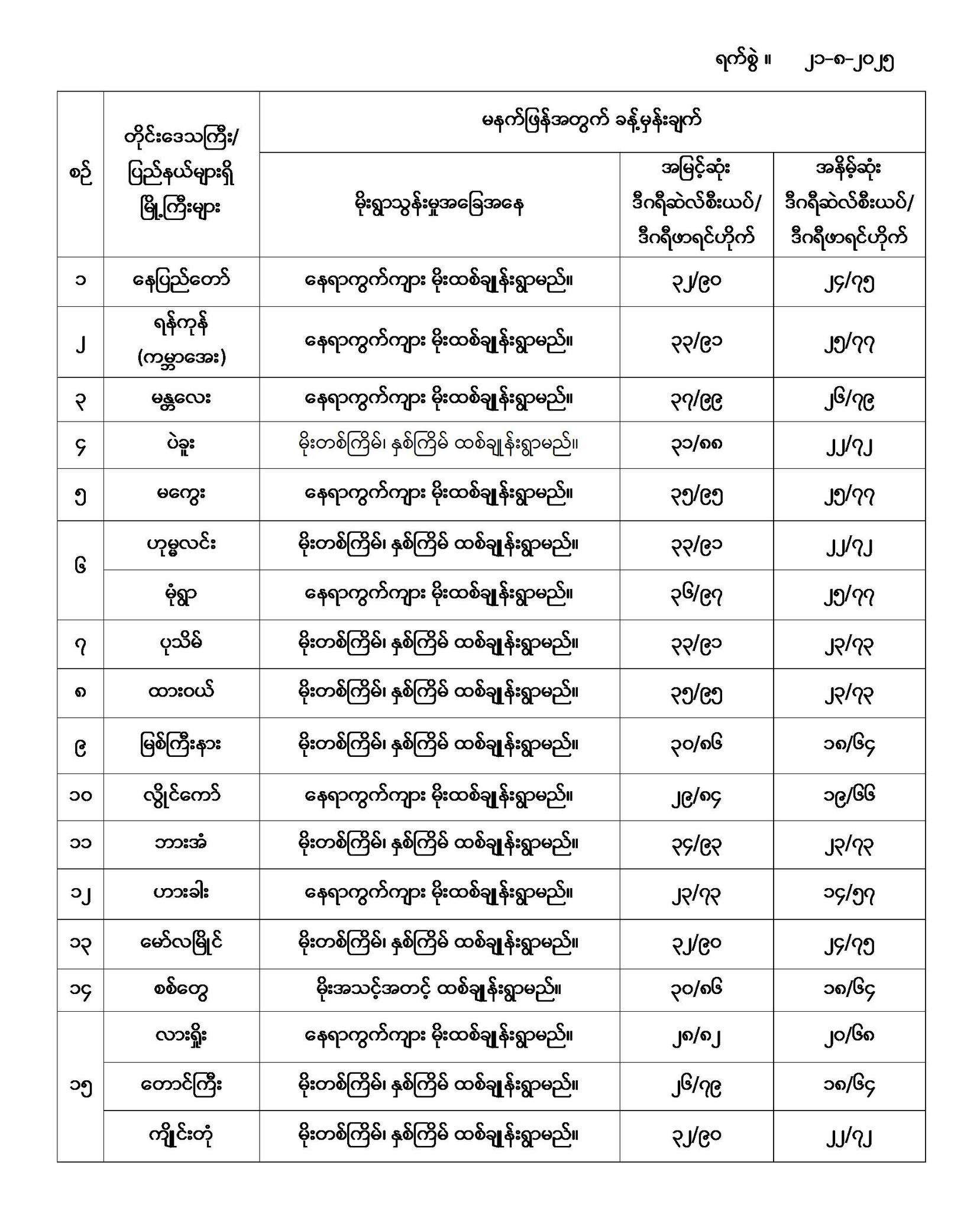 မနက်ဖြန်အတွက် တိုင်းဒေသကြီးနှင့် ပြည်နယ်များရှိ မြို့ကြီးများ၏ အမြင့်ဆုံးအပူချိန်၊ အနိမ့်ဆုံးအပူချိန်နှင့် မိုးလေဝသခန့်မှန်းချက်တို့ပဲဖြစ်ပါတယ်---