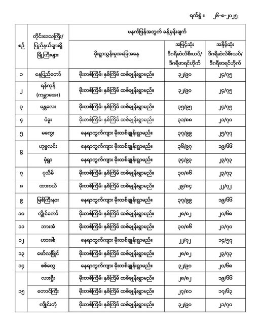မနက်ဖြန်အတွက် တိုင်းဒေသကြီးနှင့် ပြည်နယ်များရှိ မြို့ကြီးများ၏ အမြင့်ဆုံးအပူချိန်၊ အနိမ့်ဆုံးအပူချိန်နှင့် မိုးလေဝသခန့်မှန်းချက်တို့ပဲဖြစ်ပါတယ်---