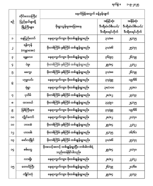 မနက်ဖြန်အတွက် တိုင်းဒေသကြီးနှင့် ပြည်နယ်များရှိ မြို့ကြီးများ၏ အမြင့်ဆုံးအပူချိန်၊ အနိမ့်ဆုံးအပူချိန်နှင့် မိုးလေဝသခန့်မှန်းချက်တို့ပဲဖြစ်ပါတယ်---