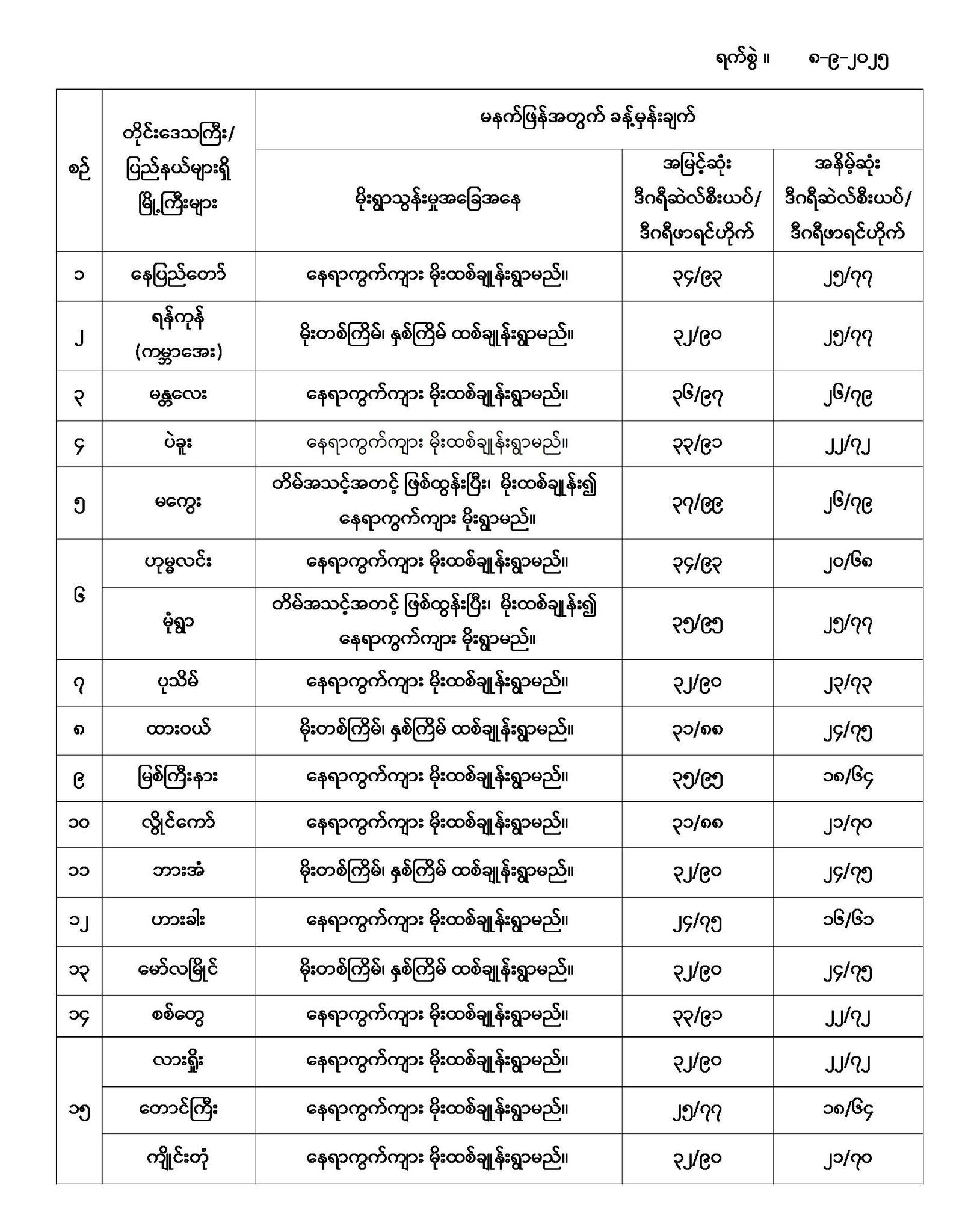 မနက်ဖြန်အတွက် တိုင်းဒေသကြီးနှင့် ပြည်နယ်များရှိ မြို့ကြီးများ၏ အမြင့်ဆုံးအပူချိန်၊ အနိမ့်ဆုံးအပူချိန်နှင့် မိုးလေဝသခန့်မှန်းချက်တို့ပဲဖြစ်ပါတယ်---