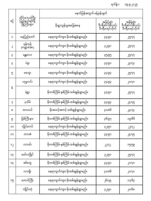 မနက်ဖြန်အတွက် တိုင်းဒေသကြီးနှင့် ပြည်နယ်များရှိ မြို့ကြီးများ၏ အမြင့်ဆုံးအပူချိန်၊ အနိမ့်ဆုံးအပူချိန်နှင့် မိုးလေဝသခန့်မှန်းချက်တို့ပဲဖြစ်ပါတယ်---