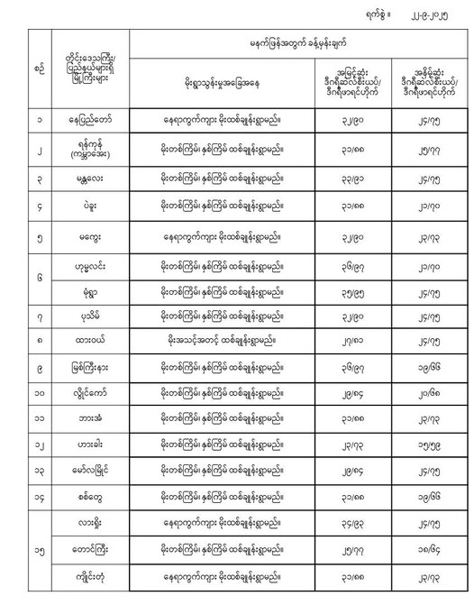 မနက်ဖြန်အတွက် တိုင်းဒေသကြီးနှင့် ပြည်နယ်များရှိ မြို့ကြီးများ၏ အမြင့်ဆုံးအပူချိန်၊ အနိမ့်ဆုံးအပူချိန်နှင့် မိုးလေဝသခန့်မှန်းချက်တို့ပဲဖြစ်ပါတယ်---