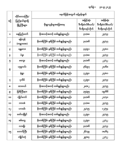 မနက်ဖြန်အတွက် တိုင်းဒေသကြီးနှင့် ပြည်နယ်များရှိ မြို့ကြီးများ၏ အမြင့်ဆုံးအပူချိန်၊ အနိမ့်ဆုံးအပူချိန်နှင့် မိုးလေဝသခန့်မှန်းချက်တို့ပဲဖြစ်ပါတယ်---