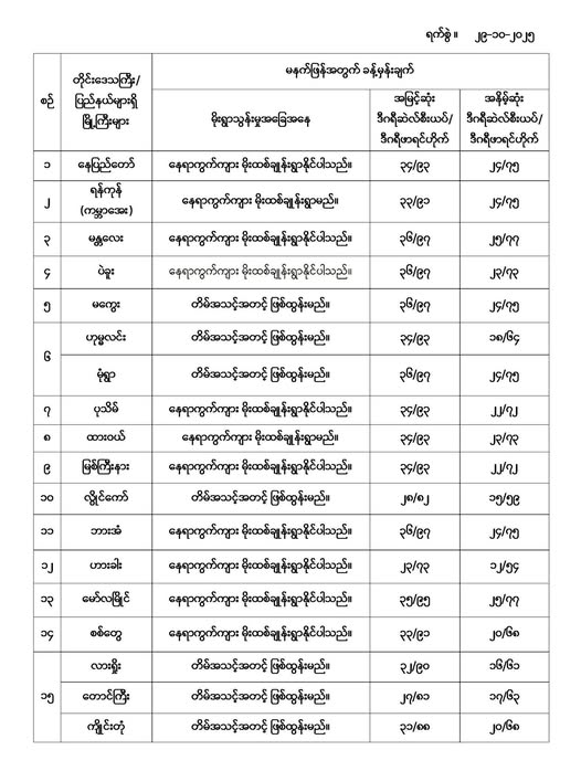 မနက်ဖြန်အတွက် တိုင်းဒေသကြီးနှင့် ပြည်နယ်များရှိ မြို့ကြီးများ၏ အမြင့်ဆုံးအပူချိန်၊ အနိမ့်ဆုံးအပူချိန်နှင့် မိုးလေဝသခန့်မှန်းချက်တို့ပဲဖြစ်ပါတယ်---