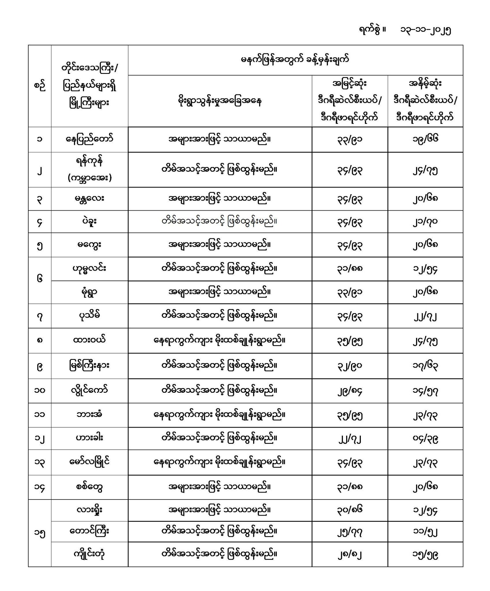မနက်ဖြန်အတွက် တိုင်းဒေသကြီးနှင့် ပြည်နယ်များရှိ မြို့ကြီးများ၏ အမြင့်ဆုံးအပူချိန်၊ အနိမ့်ဆုံးအပူချိန်နှင့် မိုးလေဝသခန့်မှန်းချက်တို့ပဲဖြစ်ပါတယ်---