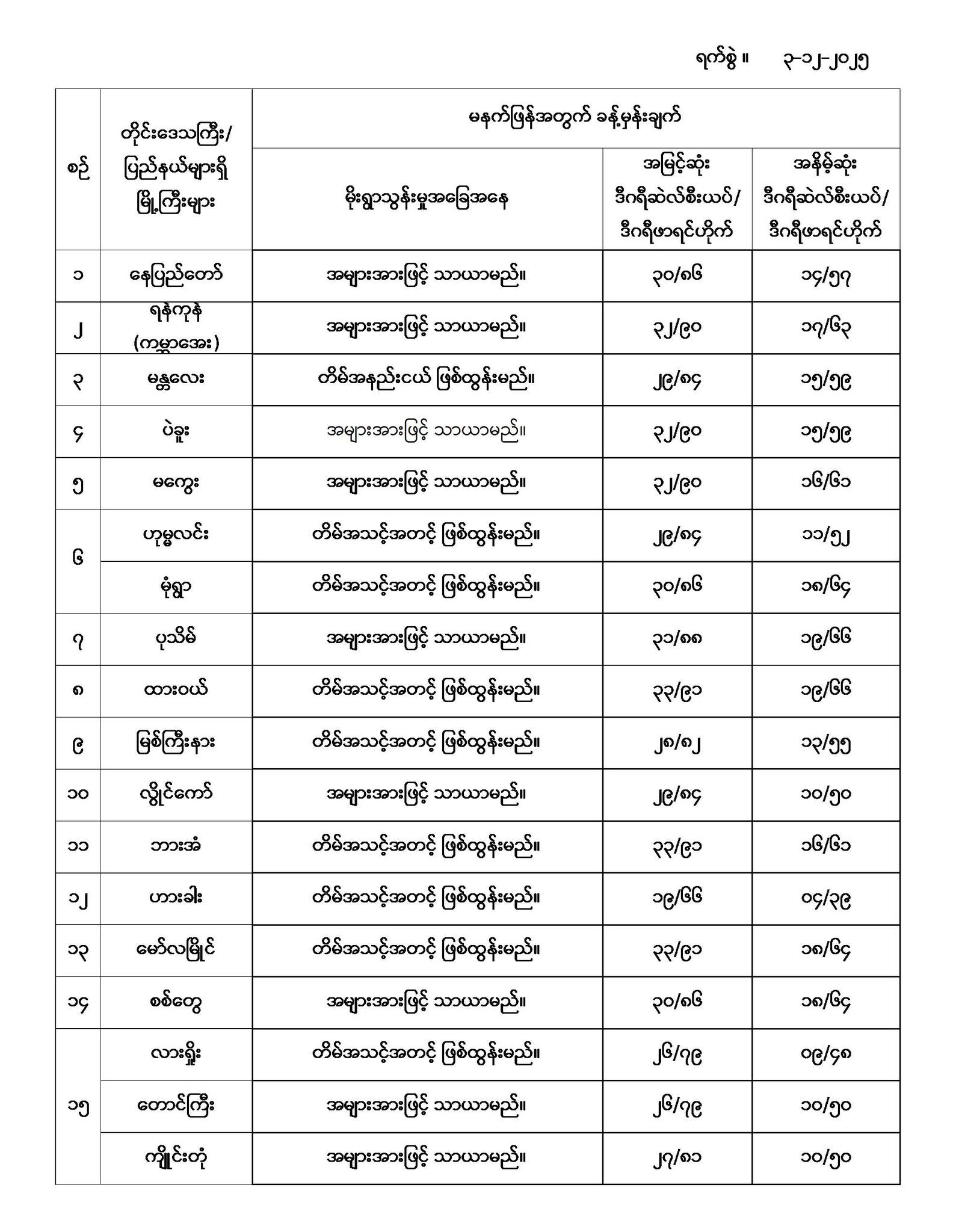 မနက်ဖြန်အတွက် တိုင်းဒေသကြီးနှင့် ပြည်နယ်များရှိ မြို့ကြီးများ၏ အမြင့်ဆုံးအပူချိန်၊ အနိမ့်ဆုံးအပူချိန်နှင့် မိုးလေဝသခန့်မှန်းချက်တို့ပဲဖြစ်ပါတယ်---