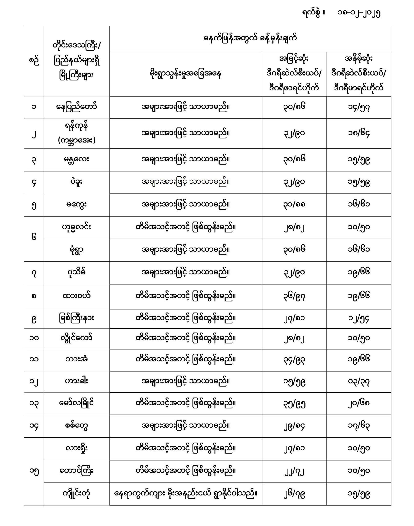 မနက်ဖြန်အတွက် တိုင်းဒေသကြီးနှင့် ပြည်နယ်များရှိ မြို့ကြီးများ၏ အမြင့်ဆုံးအပူချိန်၊ အနိမ့်ဆုံးအပူချိန်နှင့် မိုးလေဝသခန့်မှန်းချက်တို့ပဲဖြစ်ပါတယ်---